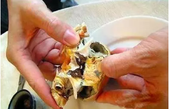 3、先吃蟹盖部分,用小勺把中间的蟹胃部分舀出,轻轻将外面包裹着的蟹黄吮干净。注意,不要吮破中间那个呈三角锥形的蟹胃,应将其丢弃。