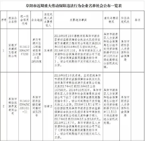 阜阳市人社局公布了近期重大劳动保障违法行为企业名单