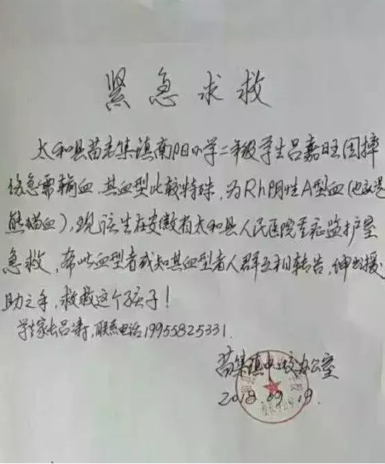 太和县苗老集镇南阳小学二年级学生吕嘉旺因摔伤急需输血,其血型比较特殊,为Rh阴性A型血(也就是熊猫血),现该学生在太和县人民医院重症监护室急救,希望此血型者或知其血型者人群互相转告,伸出援助之手,救救这个孩子!