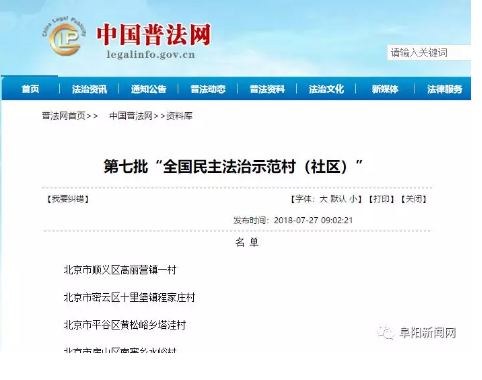近日,全国第七批“全国民主法治示范村”名单出炉,全国803个村(社区)获选,安徽22个地方上榜,其中阜阳2个社区,获评示范村(社区)称号。
